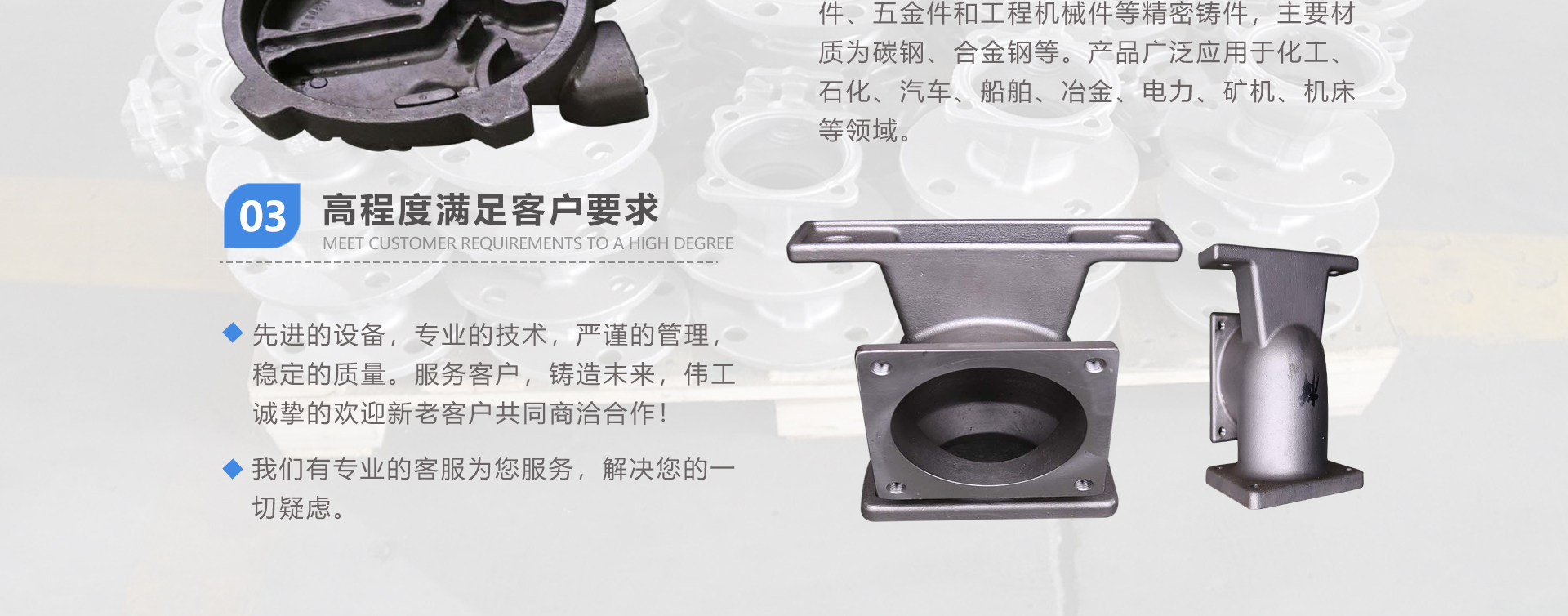 安徽偉工機械科技有限公司,坐落于安徽蕪湖新蕪經濟開發區,是一家専業從事鑄造產品設計、研發、生產、銷售于一體的企業,公司為客戶的產品提供多樣的技術支持與設計,公司主要鑄造技術有潮模砂鑄造、硅溶膠精鑄工藝。主要產品有:不銹鋼閥門配件、泵閥配件、汽車配件、工業管道配件、工程機械配件、汽車配件等。材質為:低合金鋼、304、316、316L、鉻鉬鋼、哈氏合金、碳鋼、雙相鋼等。公司已先后通過ISO9001和TS16949等多種體系審核,以完備的管理手段和齊全的檢測設備滿足客戶需求,進的設備,専業的技術,嚴謹的管理,穩定的質量。服務客戶,鑄造未來,偉工誠摯的歡迎新老客戶共同商洽合作
